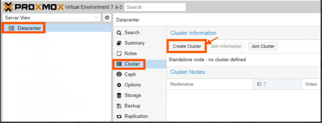 ssh-copy-id root@proxmox-node3Cluster yapısını kurmak için tüm sunucular hazır hale geldiğinde, web tarayıcınızdan ilk Proxmox node’una giriş yapabiliriz. İlk sunucumuz pve-host1 ise, panelde Datacenter bölümüne girip Cluster sekmesini açalım ve Create Cluster seçeneğine tıklayalım.