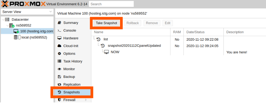 Öncelikle, Proxmox web arayüzüne giriş yapalım. Sol panelden snapshot almak istediğimiz sanal makineyi (VM) seçelim. Sonra üst menüde yer alan “Snapshots” sekmesine geçelim.